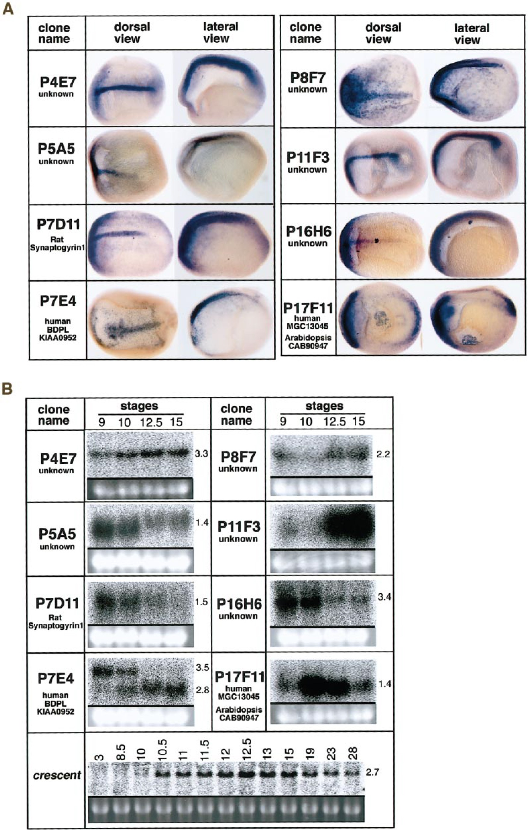 FIG. 3. Isolated cDNA clones expressed in the AEM region and notochord. (A) Clone names and similar genes or proteins in the public databases are indicated on the left side of each panel. Results of whole-mount in situ hybridization for early neurula (stage 13) are shown in dorsal (left) and lateral (right) view. (B) Northern blot analysis. Clone names and their closest genes or proteins in the public databases are indicated on the left side of each panel and the deduced mRNA size (kb) of each clone on the right (see Table 2 for P11F3). The developmental stages are indicated on the top of each column by numerical figures according to Nieuwkoop and Faber (1967). 18S rRNA stained with ethidium bromide is for loading control. Ten micrograms of total RNA from stage-9, -10, -12.5, and -15 embryos were electrophoresed in each lane, blotted, and hybridized with probes derived from each clone except for crescent. Crescent probe was hybridized to the same blot as previously used (Hikasa and Taira, 2001) with a wider range of stages as indicated. |
