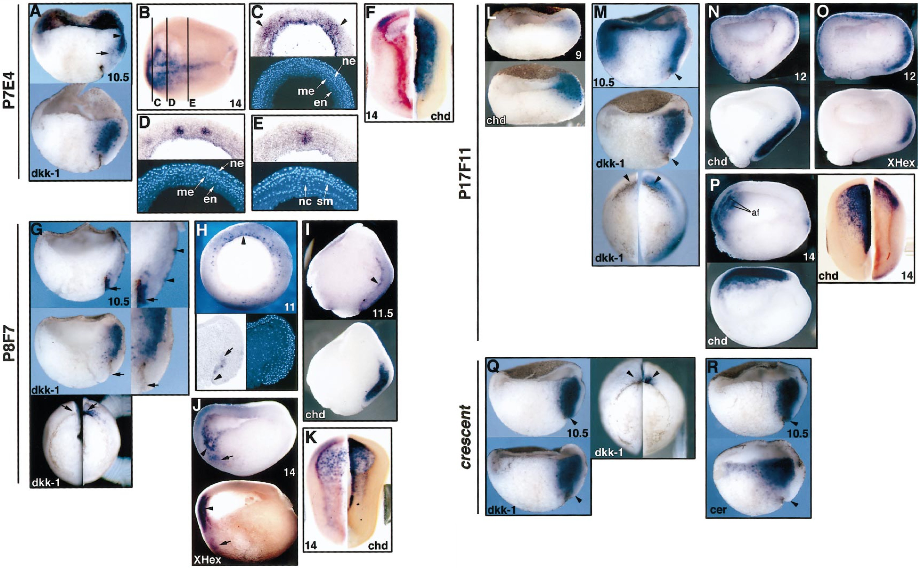 FIG. 5. Detailed expression pattern analysis of P7E4, P8F7, and P17F11 by whole-mount in situ hybridization. Whole or hemisectioned embryos were hybridized with P7E4 (A), P8F7 (G), P17F11 (L), or crescent (Q, R) probe. Other halves of hemisectioned embryos were used for dkk-1, cerberus (cer), chordin (chd), or XHex probe as indicated. Stained embryos were treated with BB/BA to become transparent for observation (B, F, K, P, right panel). Sections were made from stained whole embryos (C, H), and are shown in bright field and with DAPI staining. (A) P7E4 (homologous to human hypothetical proteins, BDPL and KIAA0952). (A) Sagittal hemisections of early gastrulae (stage 10.5) stained for P7E4 (upper panel) and dkk-1 (lower panel). P7E4 expression was detected around the Brachet cleft (arrowhead) and weakly in the mesoderm region (arrow). Dorsal to the right. (B) Dorsal view of early neurula. Anterior to the left. Cross sections were made at the indicated positions (C) which correspond to the following panels (C). (C) Sections of the same embryo as shown in (B). P7E4 was expressed in the archenteron roof as well as the bilateral domains including the neuroectoderm and mesoderm region (arrowheads) (C). The bilateral expression domains were notable in the mesodermal region at position D. In the posterior region, expression was seen in the notochord (E). (F) Dorsal view of sagittally hemisectioned neurula embryos stained for P7E4 and chordin. Anterior is up. (G) P8F7 (unknown). (G) Sagittal hemisections of early gastrula stained for P8F7 (top) and dkk-1 (middle), and vegetal view of the hemisectioned embryo (bottom). Right panels, higher magnification of the left panels. Dorsal is to the right (top, middle) or up (bottom). Arrow, the surface layer of the dorsal blastopore lip, expressing P8F7 but not dkk-1; arrowhead, punctuated expression of P8F7 in the epithelial layer of the dorsal ectoderm. (H) Vegetal view of early gastrula (upper panel, dorsal is up) and a sagittal section (lower panels, dorsal to the right). Arrowhead, dorsal blastopore lip; arrow, anterior archenteron. (I) Sagittal hemisections of midgastrula stained for P8F7 and chordin. Dorsal to the right. Arrowhead, expression of P8F7 in the anterior archenteron roof. (J) Sagittal hemisections of early neurula stained for P8F7 and XHex. Anterior to the left. Arrow, expression in the anterior endoderm; arrowhead, expression in the anterior archenteron (P8F7) or the prechordal plate (XHex). (K) Dorsal view of sagittally hemisectioned neurula stained for P8F7 and chordin. Anterior is up. (L) P17F11 (related to human MGC13045 and Arabidopsis CAB90947). (L) Sagittal hemisections of late blastula stained for P17F11 and chordin. (M) Sagittal hemisections of early gastrula stained for P17F11 (top) and dkk-1 (middle), and vegetal view of the hemisectioned embryo (bottom). Dorsal is to the right (top, middle), or up (bottom). Arrowhead, the surface layer of dorsal blastopore lip, expressing P17F11 but not dkk-1. (N, O) Sagittal hemisections of late gastrulae stained for P17F11, chordin, or XHex. Dorsoanterior to the right. (P) Sagittal hemisections of early neurula stained for P17F11 (upper) and chordin (lower), and dorsal view of the hemisectioned embryo (right). Partial breakage of the archenteron roof shows interior staining in the anterior mesoderm as indicated by af. Anterior is to the left (left panels), or up (right panel). (Q, R) crescent. (Q) Sagittal hemisections of early gastrula stained for crescent (upper) or dkk-1 (lower), and vegetal view of the hemisectioned embryo (right). Dorsal is to the right (left panels), or up (right panel). (R) Sagittal hemisections of early gastrula stained for crescent and cerberus. Dorsal is to the right. Arrowheads, the surface layer of dorsal blastopore lip, expressing crescent but not dkk-1 or cerberus. Numerical figures in the panels indicate the developmental stages according to Nieuwkoop and Faber (1967). Pictures of hemisections stained for dkk-1, cerberus, chordin, and XHex were flipped for comparison. af, artifact; en, endoderm; nc, notochord; ne, neuroectoderm; sm, somitic mesoderm. |