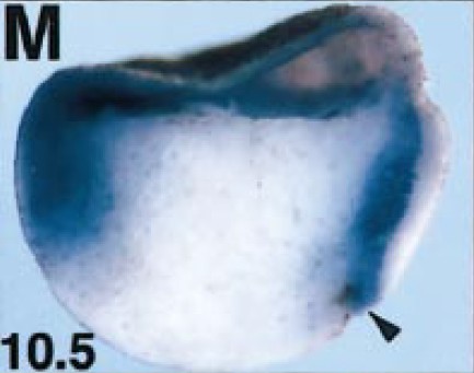 nudt22 (nudix hydrolase 22) gene expression in Xenopus laevis embryos, NF stage 10.5, as assayed by in situ hybridization. Bisected gastrulae: Dorsal to the right.
