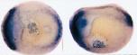 mob2.1 (MOB kinase activator 2) gene expression in Xenopus laevis embryos, NF stage 13, as assayed by in situ hybridization. Left image: dorsal view, anterior left. Right image: lateral view of bisected embryo: anterior left, dorsal up.