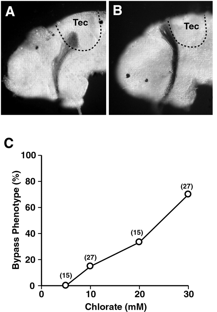 Fig. 3. Induction of the bypass phenotype by chlorate treatment. Chlorate was applied to exposed brains (stage 35/36 to 40) to inhibit the sulfation of endogenous HS. (A) Control projection crosses the diencephalon/midbrain boundary (dashed line anteriorly) to enter the anteriortectum (Tec). (B) Projection exposed to 30 mM of chlorate veers abnormally around the anterior border of the tectum and extends dorsally within the diencephalon. (C) Dose-response curve for the bypass phenotype induced with chlorate. The number of embryos exhibiting the phenotype is plotted as a percentage of the total number of embryos in each condition. Numbers in parentheses indicate total number of embryos per experimental condition.
