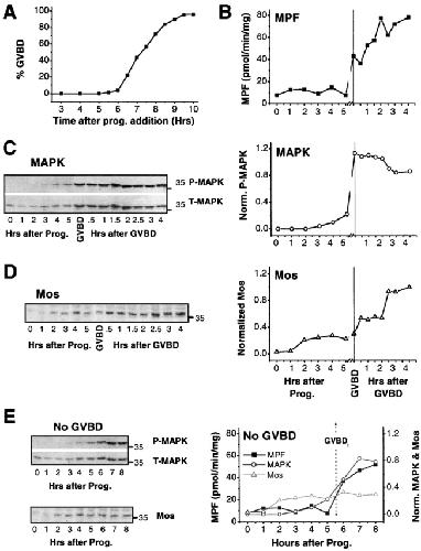 Figure 2. Time course of MPF, MAPK, and Mos activation during progesterone-induced maturation. (A) Time course of GVBD. GVBDi occurred at 5.5 h, and GVBD50 ∼7.25 h after progesterone addition. At each time point, five cells were pooled to quantify kinase activity. (B–D) MPF, P-MAPK, and Mos levels during oocyte maturation. MPF activity was measured as the histone H1 kinase activity as described in Materials and methods. The levels of P-MAPK and Mos were determined by Western blot analysis using a P-MAPK–specific and anti-Mos antibody, respectively, as described in Materials and methods. In the case of MAPK, the same blot was reprobed with an antibody that detects total MAPK (T-MAPK) levels, showing that MAPK was present in the lysates but was not phosphorylated. To be able to compare P-MAPK and Mos levels between different experiments, we always ran a positive control lysate from eggs on every gel, and normalized P-MAPK and Mos levels to that sample. Therefore, Western data for P-MAPK and Mos throughout this manuscript are normalized to the same egg lysate (see Materials and methods for more details). The time scale is divided into two phases: after progesterone addition; and after GVBD. The 35-kD molecular mass marker is shown on the right of the gels. (E) MPF, P-MAPK, and Mos levels in cells treated with progesterone, but that did not undergo GVBD. GVBDi is indicated for reference. This time course of kinase activation is representative of five similar experiments. |