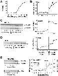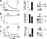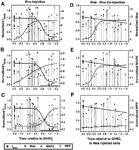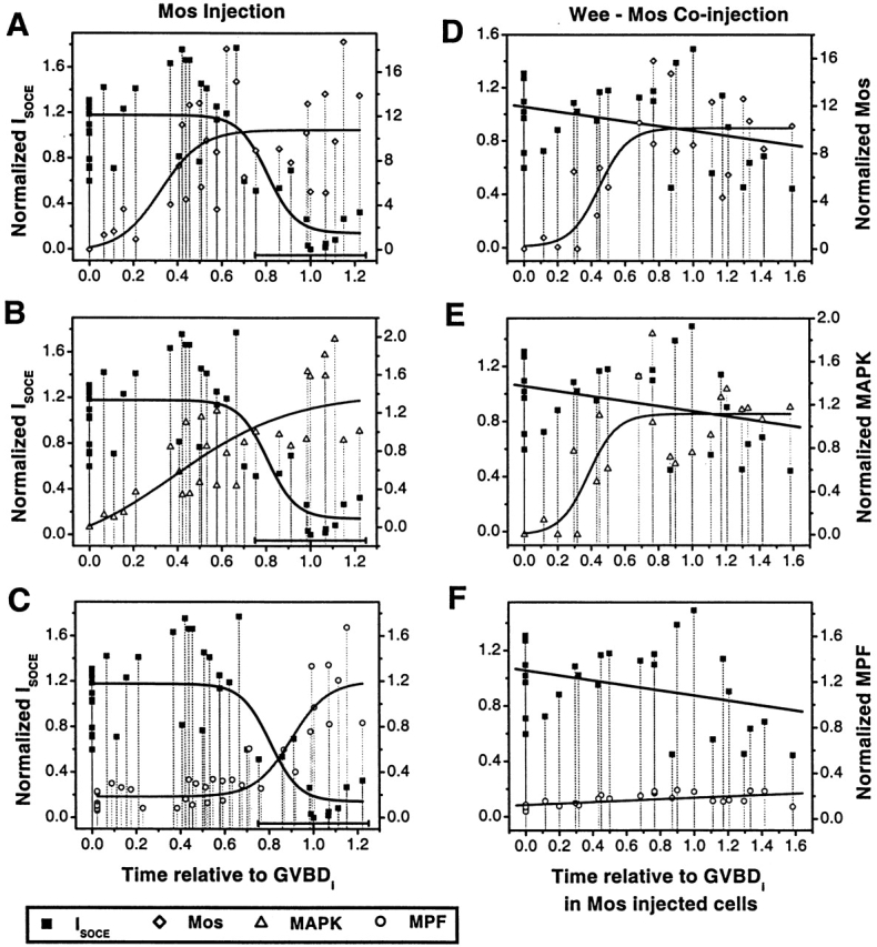 Figure 5. Correlation between ISOCE and Mos, P-MAPK, and MPF levels after injection of GST–Mos RNA. GST–Mos is a fusion protein between GST and Xenopus Mos, which allowed the separation between endogenous Mos (39 kD) and recombinant, injected GST–Mos (64 kD) (see Materials and methods). Oocytes were either directly injected with 10 ng GST–Mos RNA (A–C) or preinjected with 10 ng of GST–107Wee1 (Wee) 13–16 h before Mos RNA injection. GST–107Wee1 is a constitutively active form of the Wee1 kinase, which blocks MPF activation (Howard et al., 1999). ISOCE levels recorded at various times after GST–Mos RNA injection. After ISOCE recording, individual cells were lysed and assayed for kinase activities. This allowed us to obtain ISOCE (squares), Mos (diamonds), P-MAPK (triangles), and MPF (circles) levels from the same oocyte. For Mos and Wee1–Mos injections, current and kinase data from 40 and 27 cells, respectively, are shown. The plotted Mos data is for GST–Mos protein levels, as endogenous Mos was not detected in these experiments. The data for individual cells are connected by drop lines to help in matching ISOCE and kinase activity from the same cell. ISOCE levels were normalized to the levels in untreated oocytes, and Mos, MAPK, and MPF levels were normalized to the levels found in fully mature eggs as described in Fig. 2 and Materials and methods. The time scale was normalized to GVBDi, the standard deviation of which is shown in A–C (n = 5). Cells preinjected with GST–107Wee1 were plotted on the same time scale as GST–Mos-injected cells (D–F). Individual cell data were fitted with a Boltzman function to obtain a general trend of ISOCE inactivation and the activation of the different kinases. |