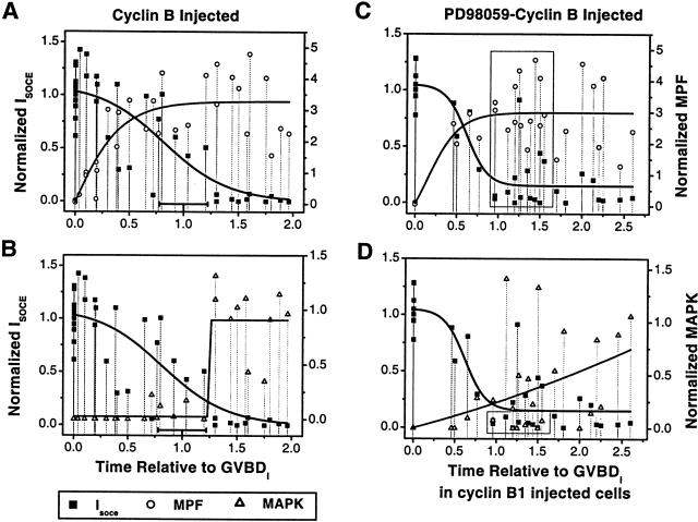 Figure 3. Correlation between ISOCE and MPF and P-MAPK levels after Δ87cyclin B1 protein injection. Oocytes were either directly injected with Δ87cyclin B1 protein (A and B) or preincubated in the MEK inhibitor PD98059 (50–100 μM) for 0.5–2 h before Δ87cyclin B1 injection. ISOCE levels were recorded at various times after Δ87cyclin B1 injection. After ISOCE recording, individual cells were lysed and assayed for MPF and P-MAPK levels. This allowed us to obtain ISOCE (squares), MPF (circles), and P-MAPK (triangles) levels from the same oocyte. The data for individual cells are connected by drop lines to help in matching ISOCE and kinase activity from the same cell. For Δ87cyclin B1 and PD98059-Δ87cyclin B1 injections, current and kinase data from 40 and 33 cells, respectively, are shown. ISOCE levels were normalized to the levels in untreated oocytes, and MPF and MAPK levels were normalized to the levels found in fully mature eggs, as described in Fig. 2. The time scale was normalized to the time at which GVBD initially appeared in the population (GVBDi) after Δ87cyclin B1 injection. The standard deviation of GVBDi is shown in A and B (n = 7). PD98059-treated cells are plotted on a time scale normalized to GVBDi in Δ87cyclin B1–injected cells (A and B). Individual cell data were fitted with a Boltzman function to obtain a general trend of ISOCE inactivation and the activation of the different kinases. |