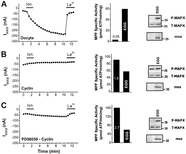 Figure 4. Representative individual cell data from Δ87cyclin B1–injected cells. MPF, P-MAPK, and Mos Western data are shown in conjunction with the levels of each kinase in fully mature eggs (EGG). (A) ISOCE was activated in response to store depletion with ionomycin (10 μM) in an oocyte, and MPF, P-MAPK, and Mos were not detected. (B) A representative oocyte injected with Δ87cyclin B1. ISOCE was not activated in response to store depletion. MPF and P-MAPK levels were 1.6 and 0.9 times those in eggs, whereas Mos kinase was not detected in this oocyte. (C) A representative oocyte preincubated with PD98059 (100 μM) before Δ87cyclin B1 injection. ISOCE was not activated in response to store depletion, MPF levels were 2.7 times higher than those found in the control egg lysate, and both P-MAPK and Mos were not detectable. |
