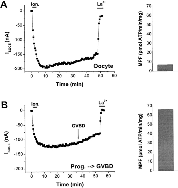 Figure 7. Continuous recording of ISOCE through the GVBD transition. (A) Prolonged recording of ISOCE from a control untreated oocyte. MPF activity in this cell is also shown. (B) ISOCE was activated in a progesterone-treated oocyte before GVBD and continuously recorded until, and past, the time point at which GVBD occurred (arrow). At the end of the experiment, the cell was lysed in extraction buffer and MPF activity was measured. This cell had high MPF activity, indicating that the prolonged recording did not interfere with MPF activation at GVBD. MPF activation at GVBD is not able to block ISOCE that has been preactivated before GVBD. |