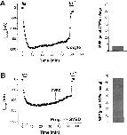 Figure 8. Pre-activated ISOCE does not inactivate in response to MPF activation. Oocytes were incubated in Ca2+-free medium (L-15 with Ca2+, buffered at 50 μM), containing thapsigargin (1 μM) to deplete intracellular Ca2+ store and activate ISOCE. Cells were voltage clamped in a Ca2+-free solution (70Mg; see Materials and methods) and then switched to a solution containing 30 mM Ca2+ (30Ca; see Materials and methods) to induce Ca2+ influx through SOCE channels. (A) ISOCE and MPF levels from a control thapsigargin–treated oocyte. (B) Oocytes were treated with progesterone (5 μg/ml) for 1 h and then thapsigargin (1 μM) was added, and the cells were incubated until GVBD occurred. ISOCE was measured ∼15 min after GVBD occurrence. ISOCE was still present in this cell, although MPF was activated at high levels, indicating that MPF is unable to block SOCE that has been preactivated before MPF induction. ISOCE (C) and MPF (D) levels in oocytes (n = 5) and cells treated with progesterone 10–15 min (n = 8) and 15–30 min after GVBD (n = 7). ISOCE levels gradually declined after GVBD and MPF levels remained relatively stable. |