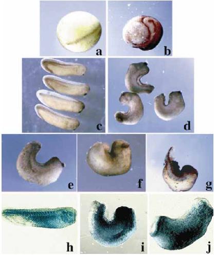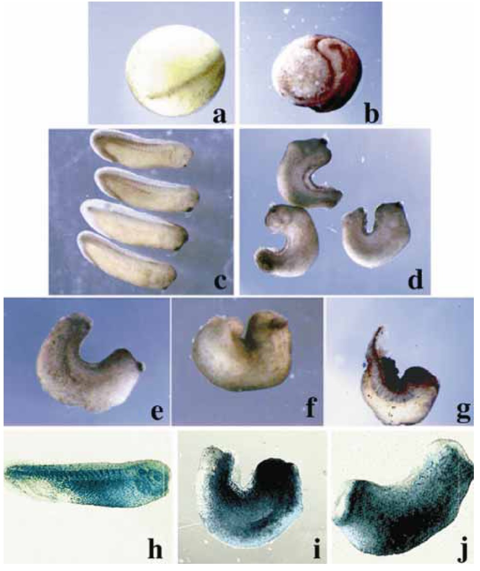 X-gal (g, h) reveals that mesodermal cells around the blastopore