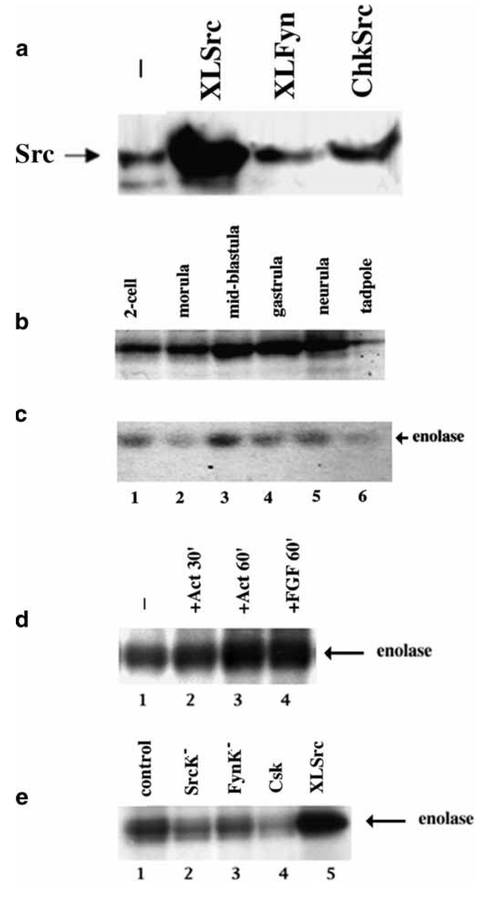 is restored by co-expression of either XLFyn (d) or XLSrc (e).