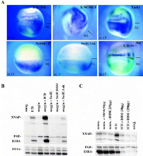 Fig. 4. XNAP expression is positively regulated by proneural genes and by the Su(H) Notch pathway. (A) Whole mount in situ hybridization analysis of XNAP expression in embryos injected into one cell at the two cell stage with the mRNA as indicated. Each panel shows views of neurula stage injected embryos with anterior to the right. Overexpression of the proneural X-NGNR-1 and Xash3 genes as well as of the active forms of Notch (Notch ICD) and Su(H) (Su(H)Ank) induces XNAP expression. In contrast, overexpression of the dominant negative form of X-delta-1(X-Delta-1Stu) inhibits XNAP expression. Due to the short time of staining performed to visualize the strong ectopic XNAP expression induced by ICD or Su(H)Ank, the endogenous XNAP expression on the uninjected sides of these embryos cannot be seen. (B) RNAase protection analysis of the expression of XNAP and ESR1 in animal caps derived from embryos injected at the four cell stage with the indicated mRNA. When indicated, Noggin mRNA was added to neuralize the cells. FGFr RNA expression is used as a loading control. Ectoderm was removed from embryos at blastula stages and assayed at neurula stage. Note that the XNAP induction by ICD overexpression is higher in neuralized than in non-neuralized cells (left panel). (C) RNAase protection analysis performed as described in (B) showing that the induction of XNAP by Notch ICD can be effectively blocked by inclusion of a the dominant negative mutant of Su(H), Su(H)DBM, while that by X-NGNR-1 is only partially affected (right panel).
