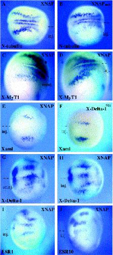 Fig. 6. Effects of XNAP on primary neurogenesis. Xenopus embryos at the two cell-stage were injected into one cell with the indicated RNA along with LacZ mRNA. Injected embryos were fixed at neurula stage, stained with X-gal and hybridized with the indicated probes. Each panel shows dorsal views of neurula stage injected embryos, with anterior to the right. Views (C,D) and (G,H) show both sides of the same injected embryo. (A,CâF) The injected side of XNAP overexpressing embryos show increased number of primary neurons. This phenotype is very similar to that observed in X-Deltastu injected embryos. (B) XNAPank reduces the number of N-tubulin positive cells; (G,H) XNAP slightly increases X-Delta expression; (I,J) XNAP reduces ESR1 and ESR10 expression in early neurula stage embryos.