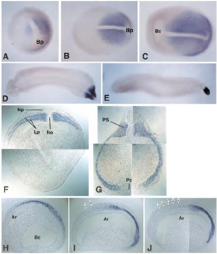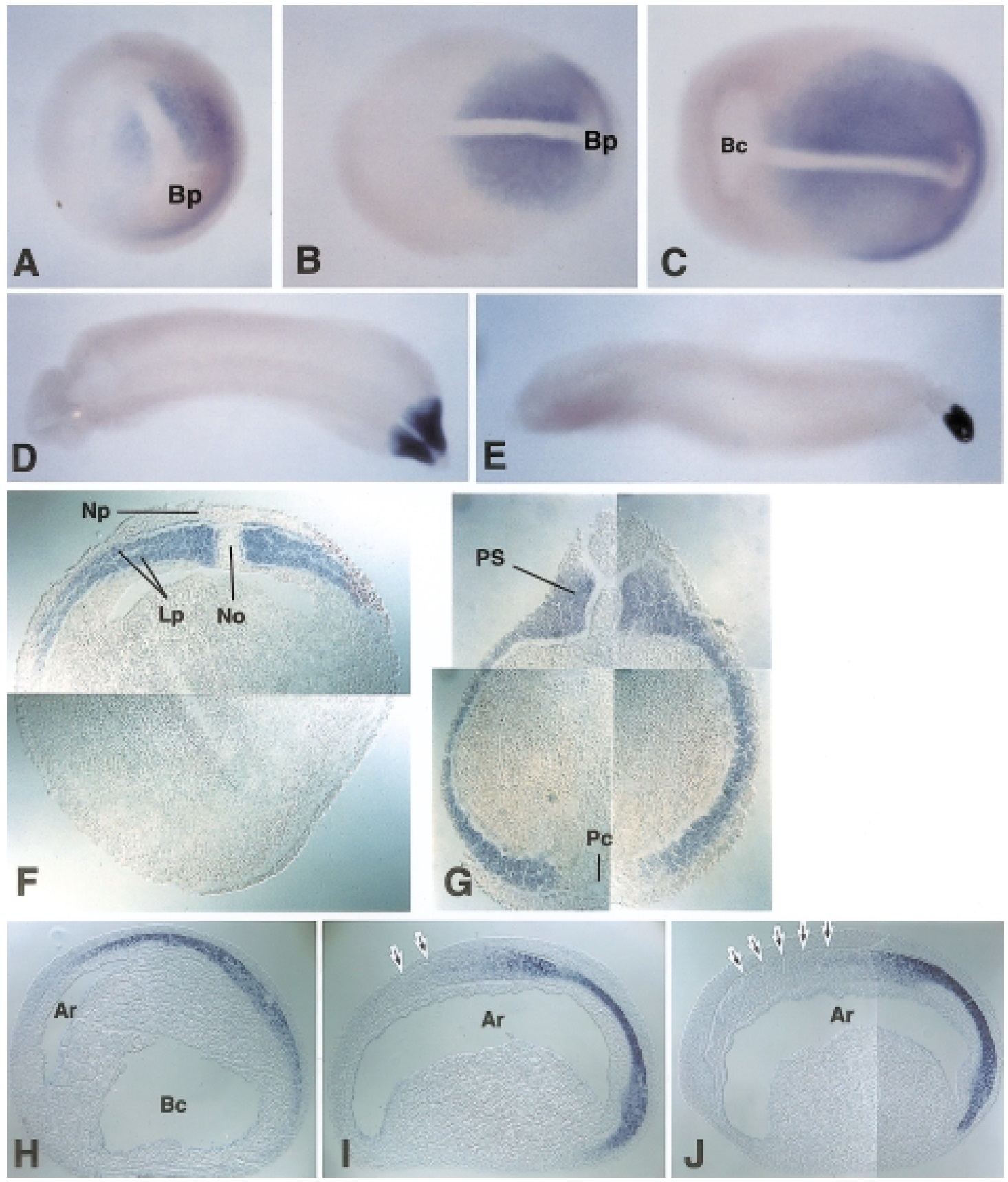 Anterior is at the left, dorsal is at the top. Ar, archenteron; Bc, blastocoele; Bp, blastopore; Np, neural plate; No, notochord; Lp, lateral