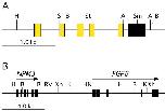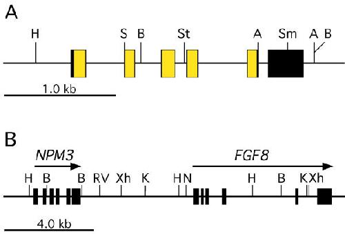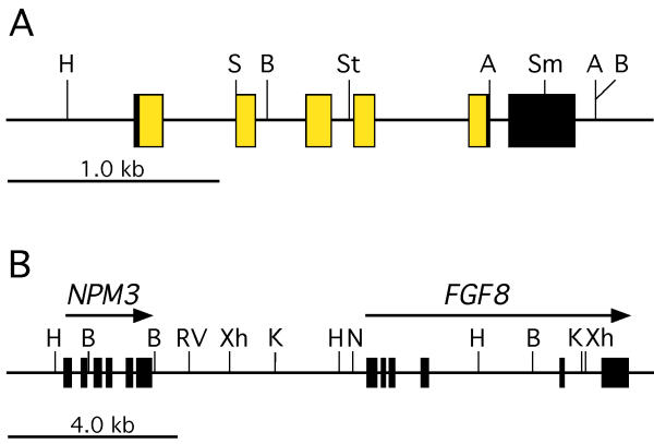 Figure 1. NPM3 genomic structure and linkage to FGF8. (A) Genomic structure of NPM3. Boxed areas represent NPM3 exons. The yellow and black shadings represent translated and untranslated regions, respectively. (B) Linkage of NPM3 to FGF8. The location of genes and restriction map were determined by a combination of sequencing and restriction mapping of lambda clones and subclones in this study and a previous study [[22]]. An NPM3 cDNA probe will hybridize to restriction fragments of the following sizes in human genomic DNA: Avr II, 0.4 and 3.9 kb; Bam H I, 1.6 and 6.0 kb; Eco R V, 7.2 kb; Hind III, 6.8 kb; Kpn I, 6.6 kb; Sac I, 1.6 and 4.0 kb; Sma I, 1.0 and 5.1 kb; Stu I, 2.6 and 14.1 kb;Xho I, 8.4 kb. Restriction enzyme abbreviations: A, Avr II; B, Bam H I; H, Hind III; K, Kpn I; RV, Eco R V; N, Not I; S, Sac I; Sm, Sma I; St, Stu I; Xh, Xho I.