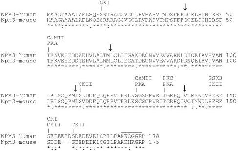 Figure 2. Comparison and features of human NPM3 and mouse Npm3 amino acid sequences. Identical amino acids are denoted by an asterisk, highly similar residues by a colon and less similar residues by a period, as determined by CLUSTAL W software. The putative nuclear localization signal is overlined. Potential phosphorylation sites in NPM3 for the indicated kinases are shown, as predicted by NetPhos 2.0. Arrows denote splice points in the mRNA. Dashes represent gaps in the alignment. Kinase abbreviations: CKI, casein kinase I; CKII, casein kinase II; CaMII, calmodulin-dependent protein kinase II; GSK3, glycogen synthase kinase 3; PKA, protein kinase A; PKC, protein kinase C.