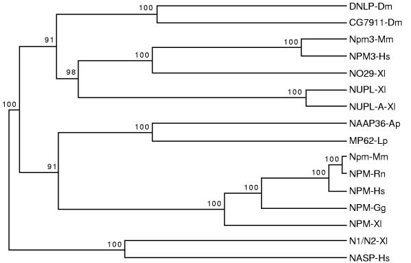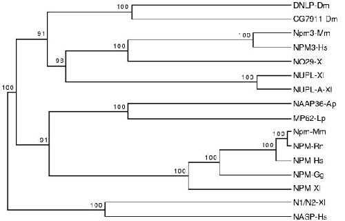 Figure 4. Dendrogram of nucleophosmin/nucleoplasmin family members. Amino acid sequences from the 16 proteins shown were aligned with CLUSTAL W, and a dendrogram was produced using the TreeTop algorithm as described in Materials and Methods. The 16 sequences included 14 from the nucleophosmin/nucleoplasmin family (see Table 2 and Figure 3) and two other histone-binding proteins (NASP and N1/N2), which are closely related to each other but unrelated to the nucleophosmin/nucleoplasmin family. Bootstrap significance values are shown at the branchpoints for 100 resamplings. The analysis suggests that NPM3 is more related to nucleoplasmins than to nucleophosmins and that NPM3 is closely related to Xenopus NO29.