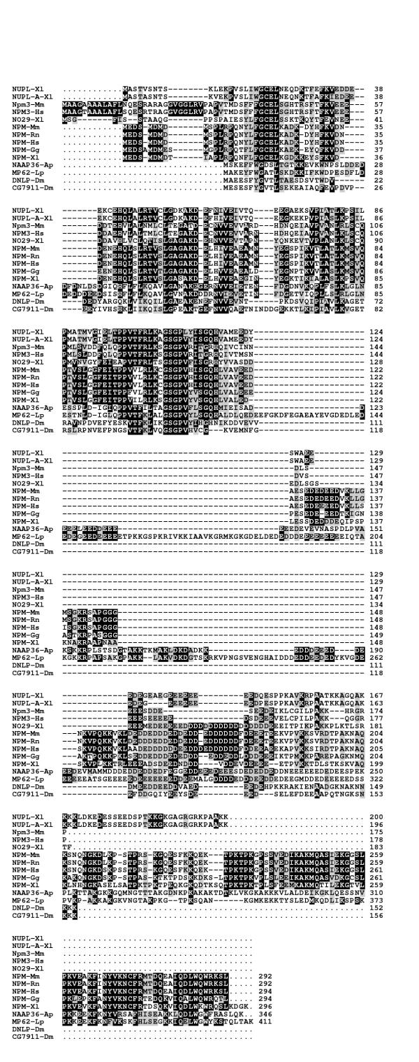 Figure 3. A comparison of nucleophosmin/nucleoplasmin family members from metazoans. The alignment was made with CLUSTAL W. Aligned residues that were identical or similar in at least 50% of the sequences, excluding gaps, were shaded with a black or gray background, respectively; additionally, any residues that were similar to a block of identical residues were shaded in gray. Similar amino acids were grouped as follows: I, L, M, V; F, W, Y; H, K, R; D, E; N, Q; A, G; S, T; P; C. The names, species, accession numbers and references for these sequences are presented in Table 2.