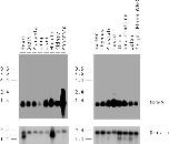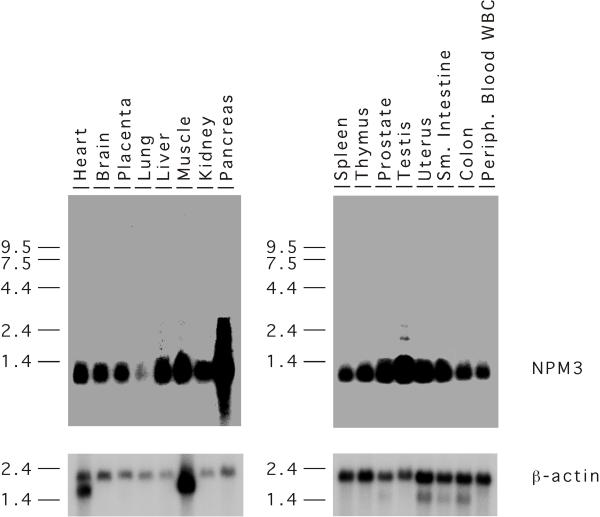 Figure 5. Northern blot expression analysis of NPM3 in human tissues. Upper panels, hybridization with the human NPM3 cDNA probe. Lower panels, hybridization with the mouse beta-actin cDNA probe. The location of the molecular weight standards in kb is indicated to the left of the blots.