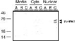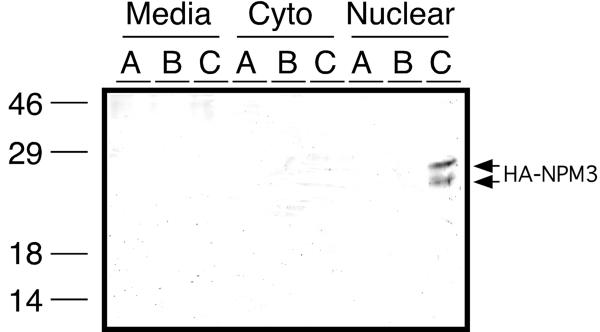 Figure 6. Immunoblot analysis of the cellular localization of HA-tagged NPM3. Protein samples (50 mg) were subjected to SDS-PAGE, electrophoretic transfer to nitrocellulose and immunoblotting with an anti-HA antibody. Media, cytoplasm and nucleus are the subcellular fractions analyzed. The locations of the molecular weight standards in kDa are indicated to the left of the blot. Arrows indicate bands associated with HA-tagged NPM3. (A) cells mock-transfected; (B) cells transfected with antisense HA-tagged NPM3 cDNA construct; (C) cells transfected with sense HA-tagged NPM3 cDNA construct.