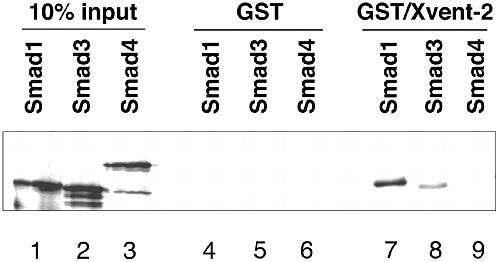 FIG. 6. Interaction of Smad1 and Xvent-2 is direct. Smad proteins