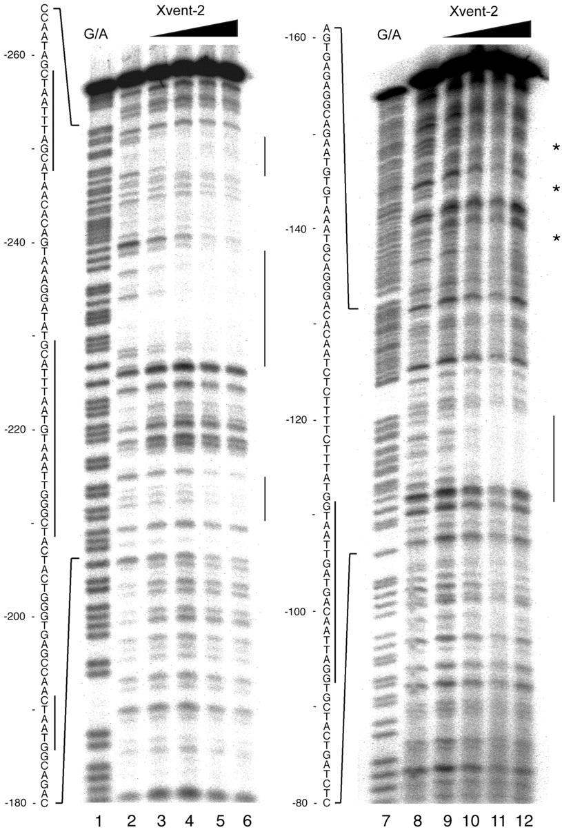 DNase I footprinting analysis of Xvent-2 protein to 32P-labeled