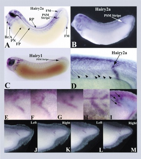 Figure 1. Pattern of hairy2 in Tailbud Stage Embryos(A) Whole-mount in situ hybridization for hairy2a RNA in a cleared stage 28 embryo. Expressing tissues include: PSM Stripe (the anterior presomitic mesoderm stripe), FP (neural tube floorplate), RP (neural tube roofplate), Br.A (branchial arches), PN (pronephros), FM (fin mesenchyme), as well as the brain and eye.(B) Similar in situ in an uncleared embryo.(C) In situ for hairy1.(D) In situ for hairy2a in a stage 26 embryo (plastic embedded and imaged with DIC optics). Arrowheads indicate somite borders.(EâH) Proposed order of hairy2a PSM stripe patterns (dorsal is top, anterior is left).(I) hairy2a PSM stripes in three adjacent presumptive somites (magenta, marked by arrows).(J) (left) and (K) (right) sides of the same embryo showing different patterns for hairy2a (the left side has been flipped to be in the same orientation as the right side). A similar pair of images from another embryo is shown in (L) and (M)