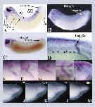 Figure 3. Reconstitution of the hairy2a Pattern in Transgenic Xenopus Embryos(A) Whole-mount in situ hybridization for eGFP using the H2pm transgene.(B) H2pmH2G transgenes express eGFP in the PSM stripe (arrowheads).(C) The arrow indicates hairy2a expression in the floorplate.(D) The arrow indicates no transgene expression in the floorplate, while the arrowhead indicates expression in the roofplate.(E and F) H2pmH2G transgenes mimic the variability of the hairy2a PSM stripe.(G and H) The H2mpH2G transgene mimics the left-right asymmetry of hairy2a. The left side image has been flipped to be in the same orientation as the right side.(I) H2pm3U transgene expresses eGFP in the anterior PSM stripe (arrowhead)