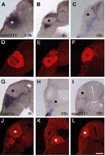 Fig. 6. Inhibition of migration alters neural crest marker expression. (A-C) twist in situ hybridisation of grafts expressing Xcad-11 0.5 hours (A), 4 hours (B) and 18 hours (C) after transplantation. GFP-Myc immunostaining of the corresponding sections shown in (D-F). δcXcad-11 overexpressing graft 4 hours (G) and 18 hours (H) after transplantation, all stained with twist in situ hybridisation probe. (I) Xcad-11-expressing graft 18 hours after transplantation stained with Snail in situ hybridisation probe. (J-L) GFP-Myc immunostaining of the corresponding sections. Asterisk marks the graft centre. Scale bar: 50 μm.