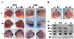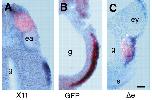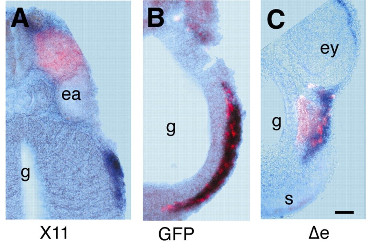 Fig. 3. Localisation of host and donor CNC cells at stage 28. (A) Transverse section showing a Xcad-11-expressing non-migrating transplant (pink), and migrating host CNC cells (blue). (B) Mixture of host (blue) and donor (pink) CNC cells in GFP-RNA injected control embryos. (C) Transverse section showing most of the δeXcad-11-expressing, migrating donor CNC cells (pink) separated from the host CNC cells (blue). Pink, immunostaining of Myc-tagged GFP; blue, twist in situ hybridisation. ea, ear vesicle; ey, eye anlage; g, gut. Scale bar: 50 μm.
