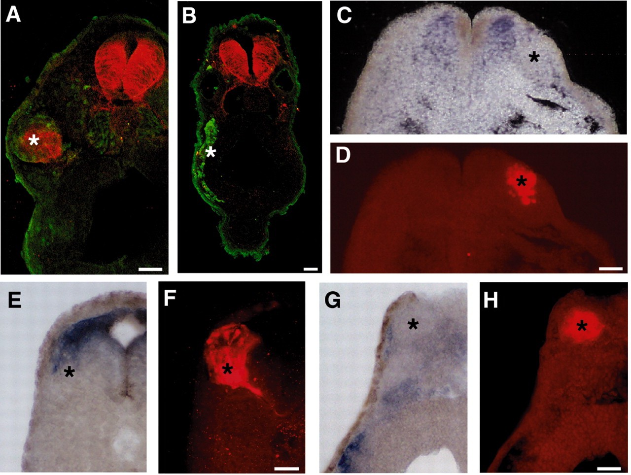 Fig. 7. Homotopic transplants show that non-migrating CNC cells adopt a neural fate. (A) Non-migrating transplant overexpressing δcXcad-11 stained with 2G9 antibody, a neural marker. (B) Migrating GFP-Myc-expressing donor CNC cells (green) are negative for 2G9 (red). (C) Whole-mount in situ hybridisation of a δcXcad-11-expressing graft shows that sox3 is not expressed 1 hour post grafting. (D) GFP-Myc immunostaining of the section shown in C. (E) In situ hybridisation with nrp-1 probe 18 hours after grafting. Donor embryo was injected with δcXcad-11 RNA. (F) GFP-Myc immunostaining of the section shown in E. Upper half of the transplant is nrp-1 positive. (G) In situ hybridisation with twist probe 18 hours after grafting. Donor embryo was co-injected with δcXcad-11 and β-catenin RNA. (H) Section shown in G immunostained with 2G9 (red). Donor embryos were injected either with 1 ng Xcad-11, 2.5 ng δcXcad-11 or 2.5 ng δ cXcad-11 plus 80 pg β-catenin RNA. Asterisks mark the graft centres. Scale bars: 50 μm.