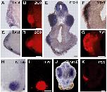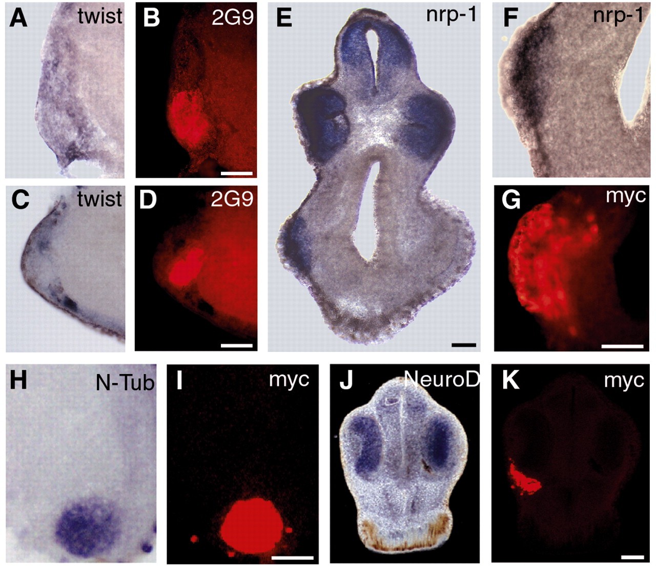 Fig. 8. Non-migrating CNC cells also adopt neural fate after heterotopic transplantation into the pharyngeal pouch area. (A) Xcad-11-expressing transplant was found to be twist negative in whole-mount in situ hybridisation but (B) positive for 2G9 neural marker expression in immunostaining. (C) Transplant from a donor co-injected with δcXcad-11 and β-catenin RNA was twist negative in whole-mount in situ hybridisation but (D) positive for 2G9. (E) Transplant from a donor co-injected with δcXcad-11 and β -catenin RNA shows nrp-1 expression in whole-mount in situ hybridisation. (F) Higher magnification of the transplant seen in E. (G) GFP-Myc immunostaining of the section shown in F. (H) N-Tubulin-positive transplant from a donor injected with δcXcad-11 RNA. (I) GFP-Myc immunostaining of the section shown in H. (J) NeuroD-positive transplant from a donor injected with δcXcad-11 RNA. (K) GFP-Myc immunostaining of the section shown in J. Donor embryos were injected either with 1 ng Xcad-11, 2.5 ng δcXcad-11 or 2.5 ng δcXcad-11 plus 80 pg β-catenin RNA. Scale bars: 50 μm.