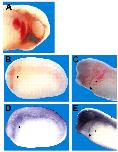 Fig. 5. Double in situ hybridisation. (A) Xcad-11 (blue) and twist (red) at stage 26. (B-E) Double whole-mount in situ hybridisation of stage 20 (B,D), and stage 26 (C,E) embryos for AP-2 (B,C, red) and Snail (D,E, blue).