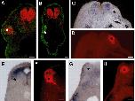 Fig. 9. Expression of Xcadherin-11 constructs neither inhibits neural crest induction nor alters CNS and PNS pattern. (A-C) Stage 15 embryos single-side injected with δcXcad-11 RNA. (D,E) Stage 20 embryos injected with δ eXcad-11 RNA. (F,G) Stage 28 embryo injected with Xcad-11 RNA. (H,I) Transverse sections of stage 28 embryo injected with Xcad-11: (H) in situ hybridisation with sox2 probe; (I) GFP-Myc immunostaining of the same section shown in H. Marker detection as indicated. b, brain; n, notochord; s, somites; asterisk, injected side. Scale bar: 50 μm.