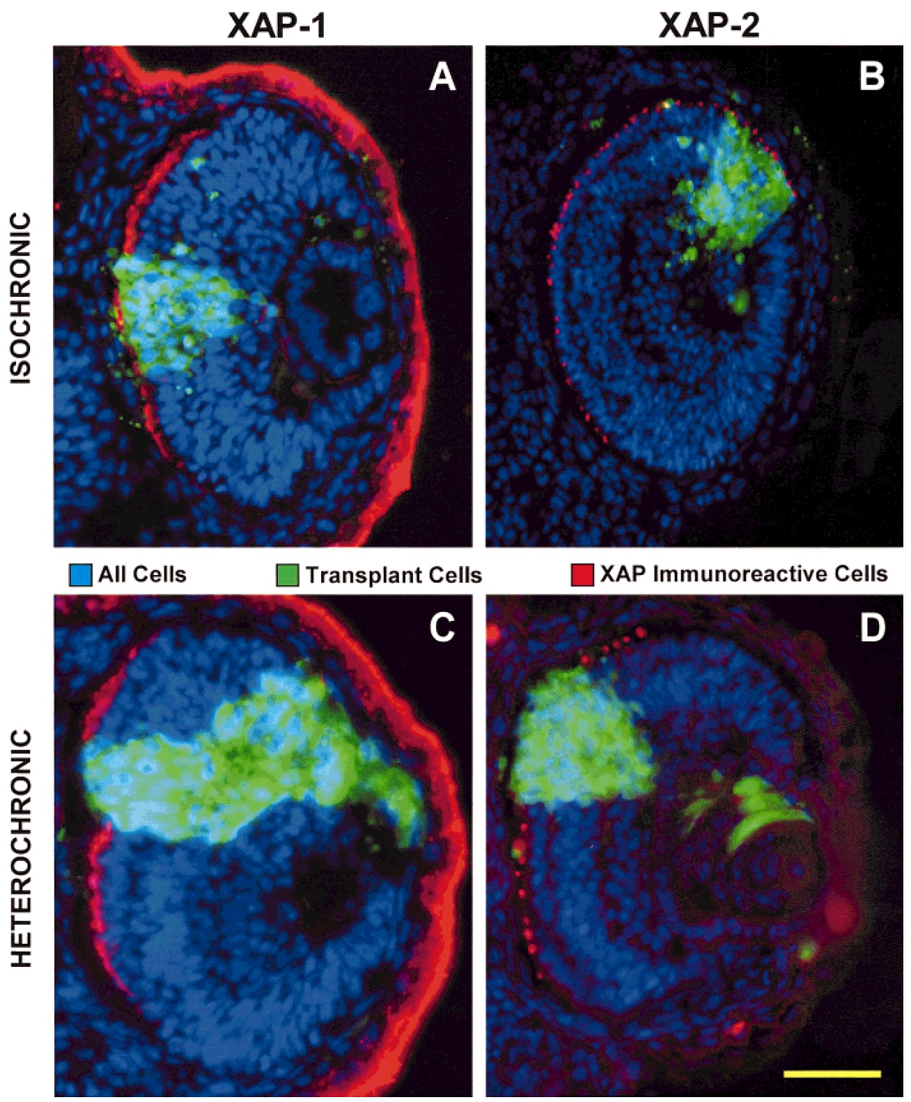 heterochronic transplant fails to express XAP-1 or -2 at any level in any region until the graft itself