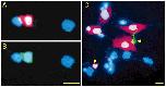 blue: bis-benzamide, stains all cell nuclei; red: dextran-TRITC filled cells, marks the population of