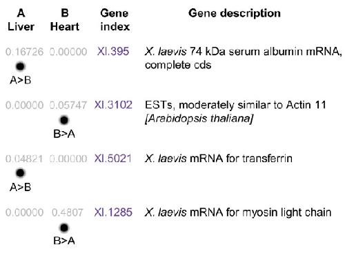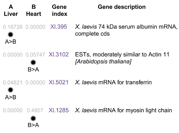 Figure 1. Example of digital differential display (DDD [10]), comparing gene expression between the liver (pool A) and heart (pool B) by comparing the available EST data from two Xenopus libraries. The top four results are shown. The numbers in grey represent the proportion of sequences within each pool that map to the UniGene cluster indicated in blue, for which a description is given on the right;cds, coding sequence. Dots are a visual representation of the numerical values. Statistically significant results are shown by indication of the relationship between two pools for a particular gene cluster, for example A > B for albumin and transferrin in the liver, B > A for myosin light chain and a probable actin homolog in the heart library.