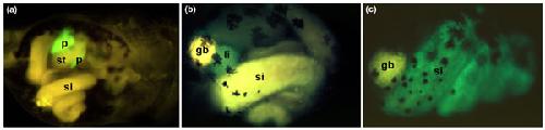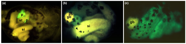 Figure 2. Analysis of gut-specific promoters in live X. laevis tadpoles. Green fluorescence is seen where the promoter is active, and yellow is due to autofluorescence of the tadpolegut. Black patches are pigment cells. (a) The Elastase enhancer (rat) driving the expression of GFP in the pancreas of a 7-day-old tadpole; ventral view, anterior to the right. (b) The Transthyretin promoter (mouse) driving expression of GFP in the liver of a 6-day-old tadpole; ventral/left view, anterior to the left. (c) The Intestinal fatty acid binding protein promoter (rat) driving expression of GFP in the small intestine of a 7-day-old tadpole, ventral view, anterior to the left. Abbreviations: gb, gall bladder; li, liver; p, pancreas; si, small intestine; st, stomach. Reproduced with permission from [25].