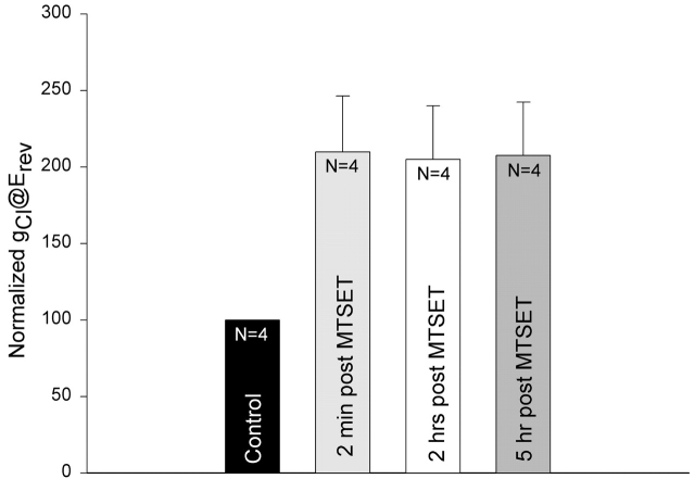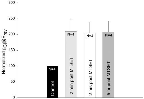 Figure 2. Modification of R334C CFTR by MTSET+ was stable for at least 5 h. The conductance (gCl@Erev) was first obtained 30–40 min after the initial exposure of the oocytes to stimulatory cocktail when the activation of the Cl− conductance had attained a steady state (control). Each oocyte was exposed to 100 μM or 1 mM MTSET+ for 20 s. The MTSET+-containing stimulatory cocktail was then replaced with stimulatory cocktail lacking the thiol reagent, and the oocytes were continuously perfused for up to 5 h. The conductances measured at 2 min, 2 h, and 5 h after exposure of oocytes to MTSET+ were normalized to the steady-state conductance before exposure to MTSET+.