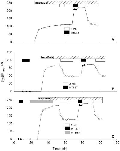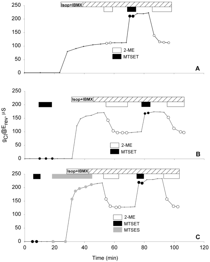 Figure 3. The entire membrane pool of R334C CFTR channels that were activated by cAMP was labeled with MTSET+ before the activation. Records of gCl versus time obtained from R334C CFTR expressing oocytes that were obtained from the same frog and assayed on the same day. Oocytes were always perfused with frog Ringer's unless noted (see materials and methods). After a control period, they were perfused with stimulatory cocktail containing 10 μM isoproterenol and 1 mM IBMX (Isop + IBMX). (A) A record of gCl versus time showing that at the steady-state activation, MTSET+ caused about a doubling of gCl. (B) A record of gCl versus time showing that the activated gCl at the steady state of an oocyte preexposed to MTSET+ was much higher than the gCl at unmodified condition as seen in A, and 2-ME reduced gCl to ∼50% of the maximum gCl. (C) A record of gCl versus time of showing that the exposure to MTSES− after prelabeling with MTSET+ had no effect on gCl before and after activation.