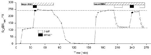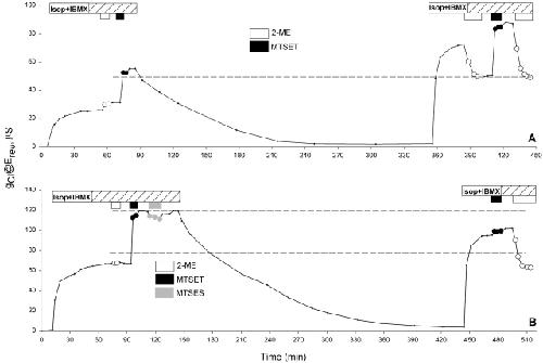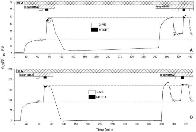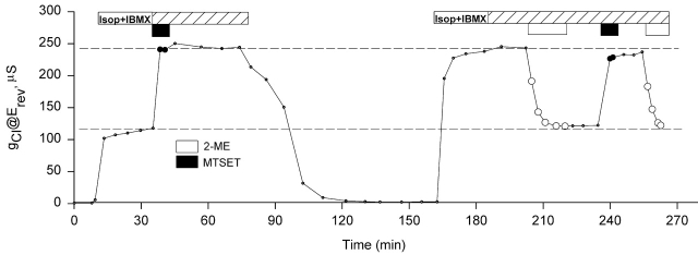 Figure 4. MTSET+ labeling did not affect the activation and inactivation process of R334C CFTR. A record of the conductance measured at the reversal potential throughout an experiment. After activation, an oocyte was exposed to 100 μM MTSET+, and then was inactivated without removing MTSET+. The oocyte was then reactivated, showing a gCl similar to the gCl before inactivation. The gCl was then reduced to ∼50% by 2-ME.