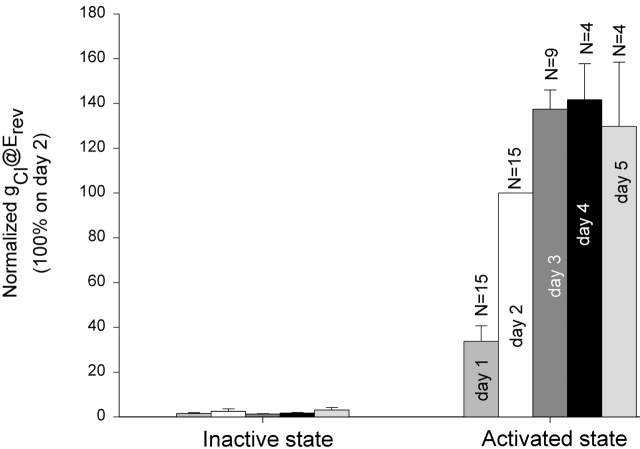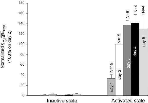 Figure 6. Time-dependent increase in the conductance of R334C CFTR in the first 5 d after cRNA injection. Oocyte conductance in both inactive and cAMP-activated states was measured on days 1, 2, 3, 4, and 5 (24, 48, 72, 96, and 120 h) after cRNA injection and the values were normalized to the conductance on day 2.