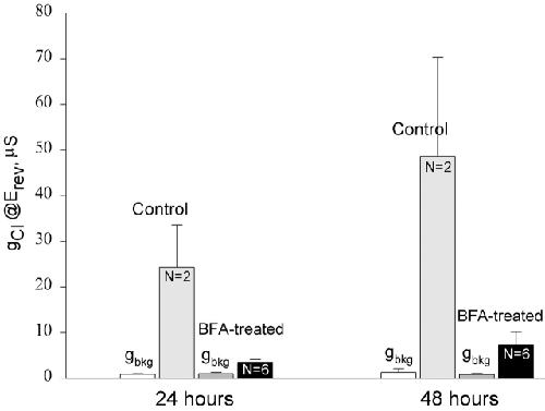 Figure 9. Long-term BFA treatment prevented the addition of new channels. Some oocytes were kept in MBSH solution as usual (control). Some oocytes were transferred to the MBSH solution containing 5 μM BFA a few hours after cRNA injection and remained in the same solution thereafter (BFA-treated). The background conductance (gbkg) and cAMP-elevated Cl− conductance (gCl) were assayed at 24 and 48 h after cRNA injection.