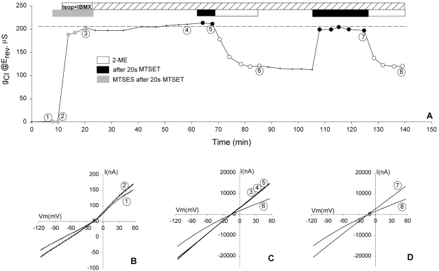 Figure 5. The entire membrane pool of R334C CFTR channels that were activated by cAMP was labeled with 20-s exposure to MTSET+ before the activation. (A) A record of the conductance measured at the reversal potential throughout an experiment. (B) Exposure to 1 mM MTSET+ or 1 mM MTSES− had no significant effects on the background conductance before activation of CFTR (1 and 2). (C) Modification by 1 mM MTSET+ for 20 s before activation prevented any further modification by MTSES+ or MTSET+ during or after activation (3–5), and 2-ME reversed the effect of MTSET+ (6). (D) Further modification by MTSET+ was possible after 2-ME treatment and was also reversed by 2-ME (7 and 8). The apparent lower values of Erev (∼17 mV) resulted from a shift in the tip potential of the recording electrode.