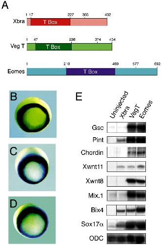 The T box proteins Xbra, VegT and Eomesodermin are expressed in similar patterns but induce the expression of different genes. (A) The structures of Xbra, VegT and Eomesodermin. Note that Eomesodermin has a larger N-terminal domain than Xbra or VegT. (B) Expression of Xbra at the early gastrula stage analysed by whole-mount in situ hybridisation. (C) Expression of VegT at the early gastrula stage. (D) Expression of Eomesodermin at the early gastrula stage. (E) Different inducing properties of Xbra, VegT and Eomesodermin. Note that all three T box proteins induce expression of Wnt11 and Bix4, that VegT and Eomesodermin induce higher levels of Pintallavis and Sox17α than does Xbra, and that Xbra cannot activate Goosecoid, chordin, Xwnt8 or Mix.1. The expression domains of the marker genes are as follows: Xwnt11, pan-mesodermal (Tada and Smith, 2000); Bix4, pan-mesendodermal (Casey et al., 1999; Tada et al., 1998); Pintallavis, dorsal mesoderm (Ruiz i Altaba and Jessell, 1992); Sox17α, endodermal (Hudson et al., 1997); Goosecoid: dorsal mesendoderm (Cho et al., 1991); chordin: dorsal mesoderm (Sasai et al., 1994); Xwnt8, ventral and lateral mesoderm (Christian et al., 1991; Smith and Harland, 1991); and Mix.1, pan-mesendodermal (Rosa, 1989). |