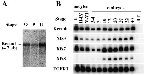 Temporal pattern of Kermit expression. (A) Northern blot of Kermit expression. Kermit was detected as a single band at 4.7 kb. Lanes 1 to 3: total RNA (20 μg) from oocytes, stage 9, and stage 11 embryos. (B) RT-PCR analyses of Kermit, Xfz3, Xfz7 and Xfz8 expression. Lanes 1 to 3: stage II, III-IV and V-VI oocytes. Lanes 4 to 11: RNA from stage 3-4, 7, 10, 12, 20, 27, 32 and 40 embryos. Lane 12: negative control without reverse transcriptase. FGFR1 was used as a loading control. |