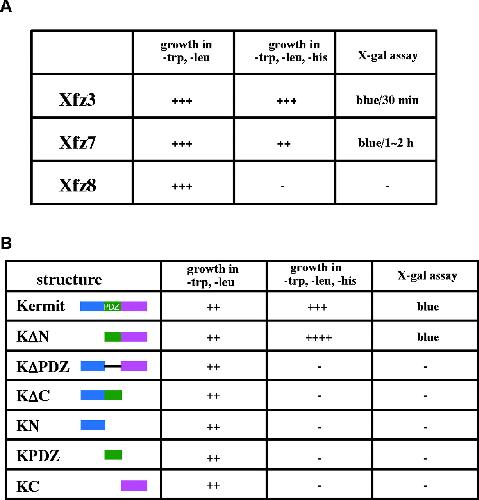Interaction of Kermit with the C termini of Xfzs in yeast two hybrid assays. Yeast strain Y190 was transformed with Kermit or Kermit mutants and Xfz3, Xfz7 or Xfz8, plated on either nonselective medium (-trp, -leu) or selective medium (-trp, -leu, -his). Growth was checked 3 to 4 days later, and the hydrolysis of X-gal was monitored on filter lifts from all plates. Plus signs indicate size of colonies; minus sign indicates no growth (in left and middle columns) or no X-gal hydrolysis (right column). (A) Interaction of Kermit with the C termini of Xfz3, Xfz7 and Xfz8. (B) Domain requirement of Kermit in interaction with Xfz3. Blue, N terminus (amino acids 1-127); green, PDZ domain (amino acids 128-217); purple, C terminus (amino acid 218-331). |
