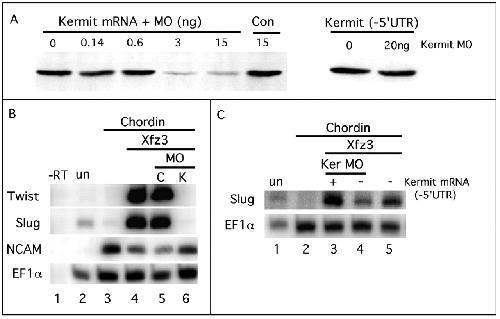 Kermit is required for neural crest induction by Xfz3. (A) Kermit morpholino antisense oligonucleotide (MO) directed against the 5â²UTR of Kermit mRNA blocks translation of Kermit protein. Kermit mRNA was injected into embryos with increasing concentrations of Kermit MO or control MO and embryo lysates were analyzed by western blotting with anti-NIP antibodies (which crossreact with overexpressed Kermit). Translation of Kermit mRNA lacking the 5â²UTR was not inhibited by the Kermit MO (20 ng MO; right panel). (B) Depletion of Kermit with antisense MO (4 ng; lane 6) reduces or eliminates neural crest induction by Xfz3 (lanes 4 and 6). Neural crest induction and RT-PCR were performed as in figure 7. Lane 1 is a no reverse transcriptase control; lane 2 shows uninjected control caps (un); lane 3 shows samples expressing chordin alone; lane 4 shows induction of neural crest makers by Xfz3 + chordin; lane 5 shows Xfz3 + chordin + control MO (C); and lane 6 shows Xfz3 + chordin + Kermit-MO (K). (C) Kermit mRNA lacking the 5â²UTR rescues inhibition by Kermit MO. Neural crest induction assay was performed as above. Kermit MO (4 ng) was injected (lanes 3, 4) with (+) or without (â) Kermit mRNA (10 pg) lacking the 5â²UTR. |