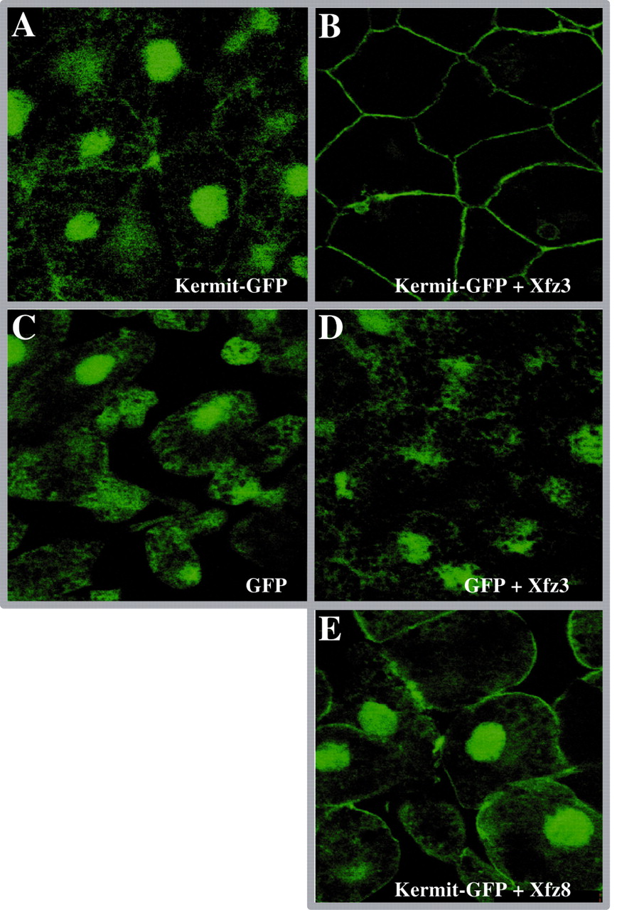 Xfz3 causes Kermit membrane translocation. Kermit-GFP or control GFP mRNA were injected into animal poles with Xfz3 or Xfz8 mRNA at the one-cell stage. Animal caps were dissected at stage 8, fixed and analyzed by confocal microscopy. (A) Kermit-GFP is localized to both cytoplasm and nucleus, similar to the GFP control (compare A with C). (B) Expression of Xfz3 causes a marked translocation of Kermit to the plasma membrane, with little remaining in the nucleus or cytoplasm. (C) Control expression of GFP, with localization in cytoplasm and nucleus. (D) Xfz3 expression has no effect on the distribution of GFP alone. (E) Xfz8 has only a small effect on Kermit subcellular distribution (compare A with E). |