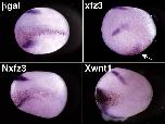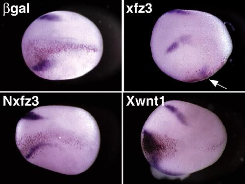 Fig. 7. Analysis of Xfz3 activity in whole embryos. Albino embryos were injected at the two cell stage with RNA into the animal pole region of either the left or rightblastomere. RNAs used were Xfz3 (0.75-3.0 ng), Nfz3 (0.75-3.0 ng), Xwnt1 (10 pg) and the lineage tracer β-galactosidase (200 pg). The red nuclear β-galactosidase staining indicates the side injected. The dark purple indicates Xslug expression. All panels are dorsal views with anterior to the left; the view of Xfz3 is slightly oblique with the arrow indicating ectopic Xslug on the injected ventrallateral side of the embryo.