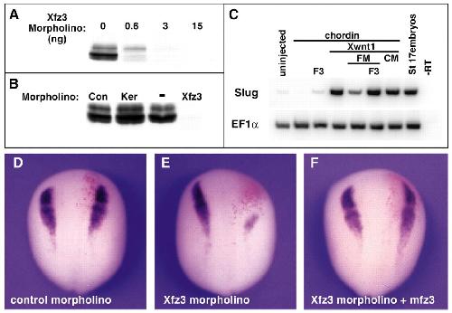 Fig. 8. Xfz3 is required for neural crest formation. (A) Xfz3-directed antisense morpholino oligonucleotide blocks translation of injected Xfz3 mRNA. Xfz3 mRNA was injected into one cell embryos together with Xfz3 morpholino at the doses indicated. Embryos were harvested at stage 10 and analyzed by western blot with Xfz3 antibodies. (B) Xfz3 mRNA was injected together with control (Con), Kermit (Ker) or Xfz3 morpholinos (2 ng each) or with no oligo (-) and stage 10 embryos were western blotted for Xfz3 as above. (C) RT-PCR analysis of Xslug expression (as in previous figures) in animal caps expressing chordin and Xwnt1, co-injected with either Xfz3 morpholino (FM; 4 ng) or control morpholino (CM; 4 ng) and harvested at stage 18. Xwnt1-dependent induction of Xslug was rescued by co-injection of an Xfz3 mRNA (F3) lacking the morpholino target sequence; this dose of F3 mRNA (10pg) caused minimal induction of Xslug in the absence of Xwnt1. (D-F) 2 ng of the control morpholino (D) or Xfz3 morpholino (E,F) were co-injected with mRNA for nuclear β-galactosidase into a single dorsal-lateral (B2) blastomere at the 32-cell stage. For rescue of Xfz3 depletion, mouse Xfz3 mRNA (0.4 ng) was co-injected with Xfz3 morpholino (F). Embryos were fixed at stage 18 and β-galactosidase activity was measured in situ (magenta) followed by whole-mount in situ hybridization for Xslug.