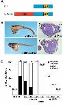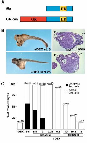 Fig. 2. Time-window of competence to respond to Siamois. (A) Schematic representation of the GR-Sia expression construct. (B) Embryos were injected ventrally with 50 pg/bl GR-Sia mRNA at the four-cell stage, and DEX (10 mM) was added at stage 6 (32-cell) or stage 9.25, and embryos allowed to develop to tadpoles (left). Note that induction of Siamois activity from stage 9.25 was not sufficient to allow for head formation. Hematoxylinâeosin staining on cross-sections revealed the formation of a full set of duplicated dorsal structures including a notochord in embryos treated with DEX at stage 6 (6/6), while embryos treated at stage 9.25 typically lacked a notochord in the secondary axis (11/12) (right). (C) Bar graph showing a compilation of three independent experiments where the activity of GR-Sia is represented as a function of time of addition of DEX. Duplicated axes were scored complete when they showed a cement gland and at least one eye. Note that head induction did not occur past stage 9 of the blastula, while trunk duplication was still pronounced 2-h later, at the onset of gastrulation (stage 10). n = total number of injected embryos.